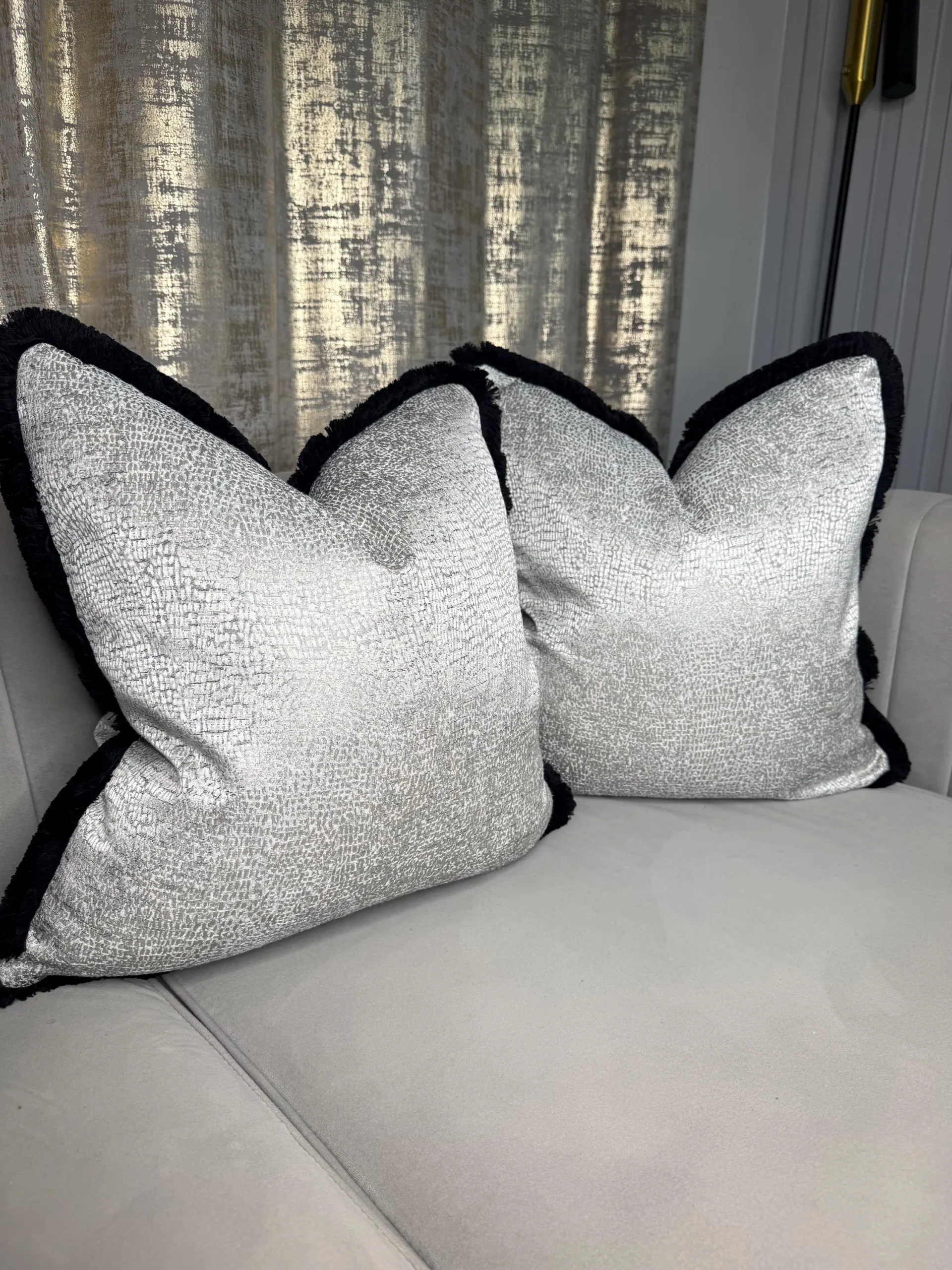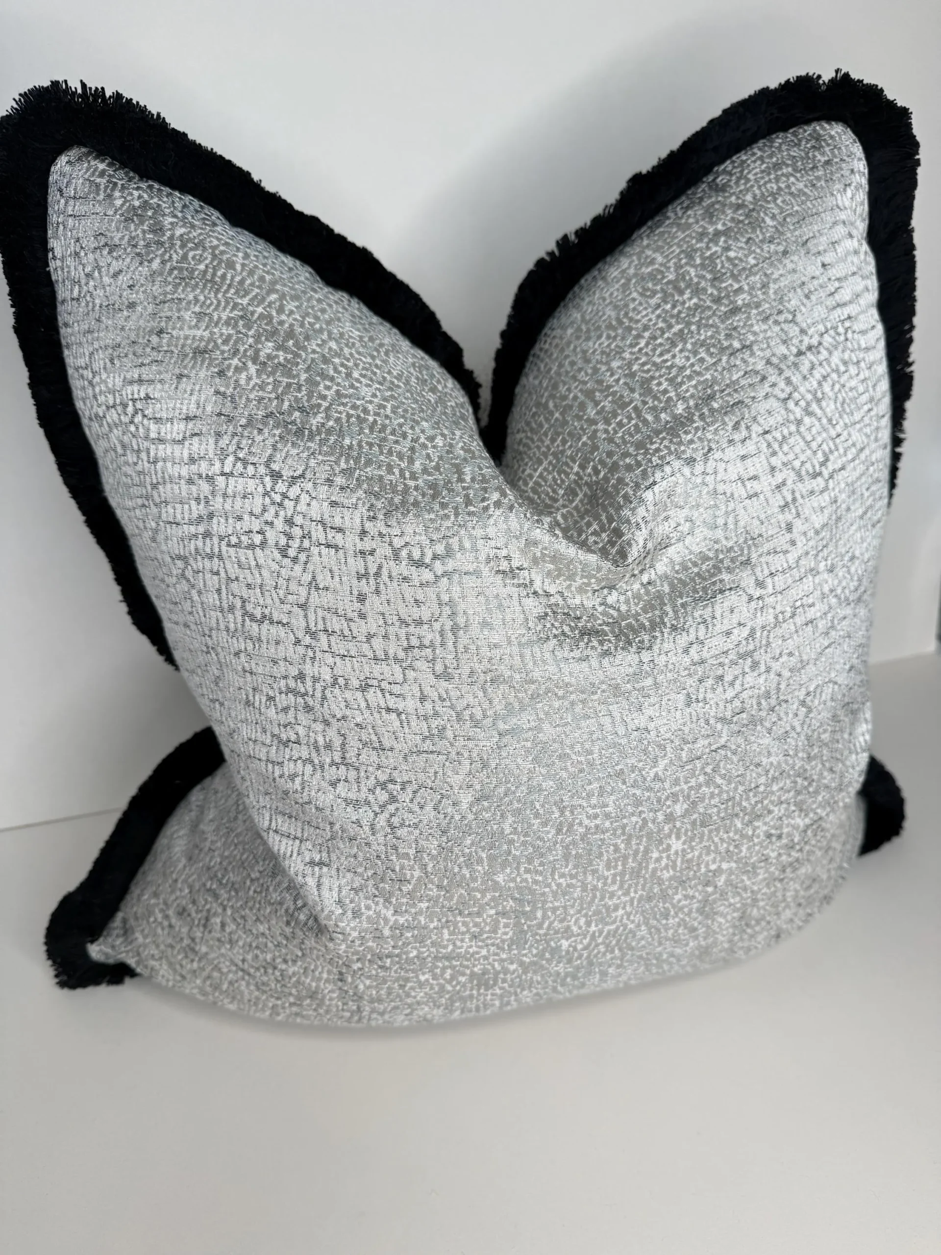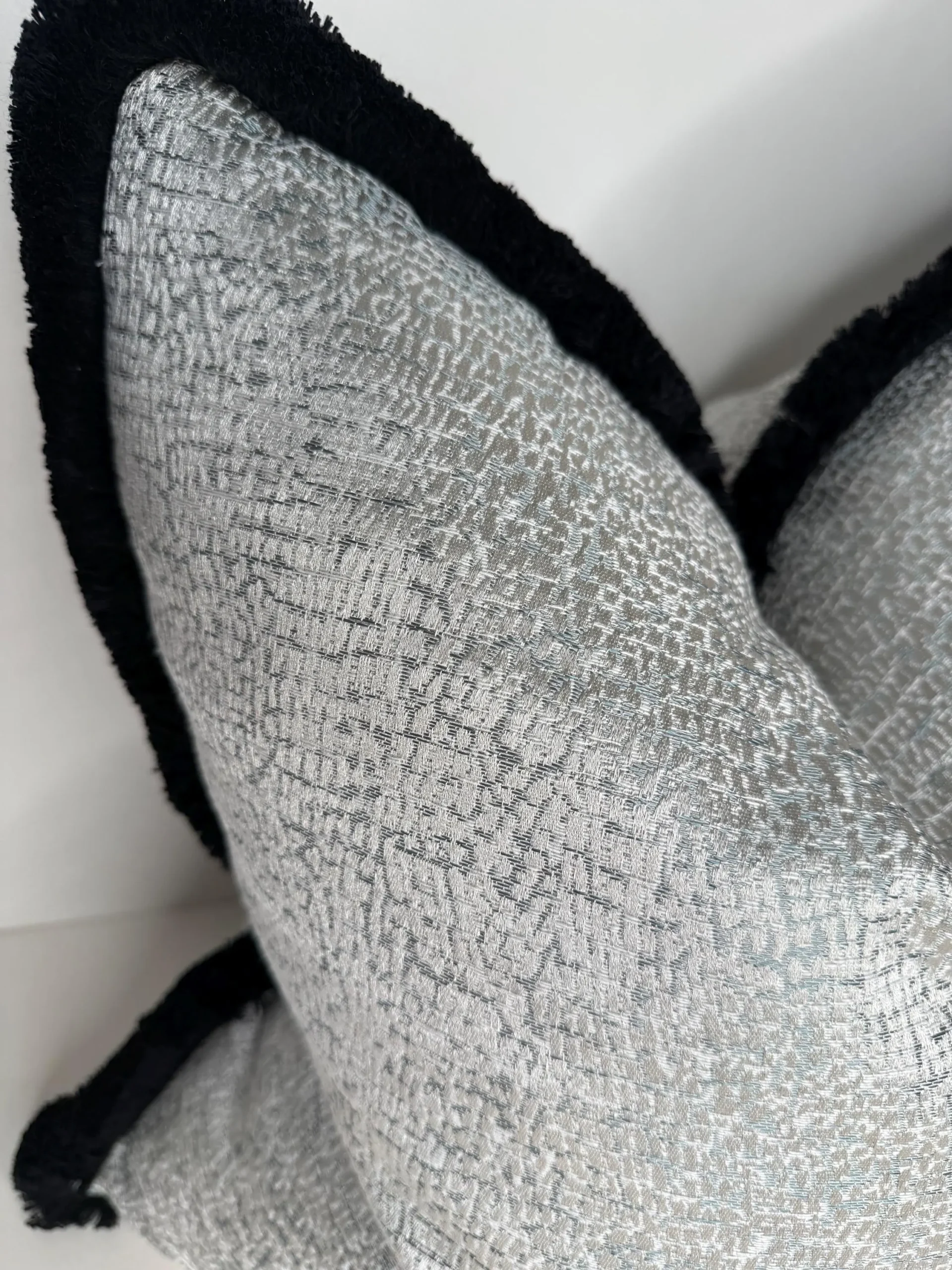Luxury Silver Grey Textured Cushion Cover with Black Contrast Fringe – Modern Designer Throw Pillow Cover